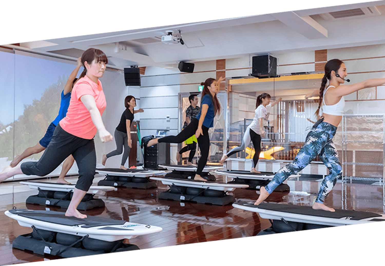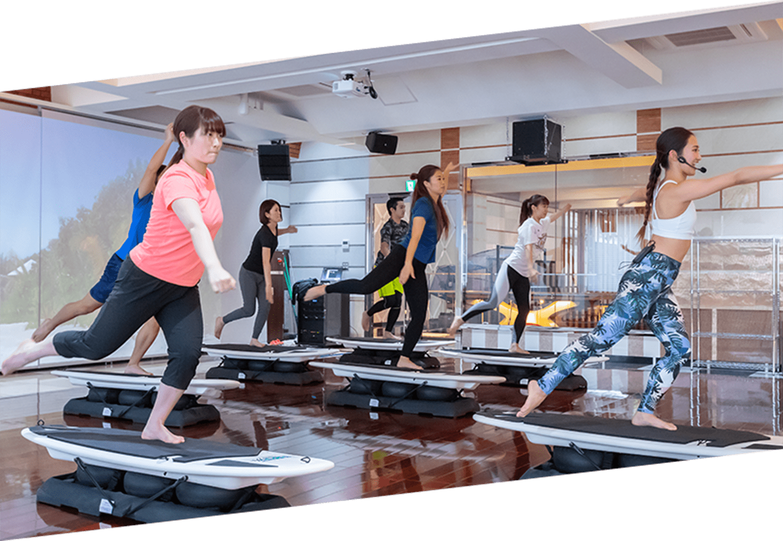 サーフエクササイズやプロジェクションヨガなど、最先端のスタジオプラグラムを楽しめるエリア。
