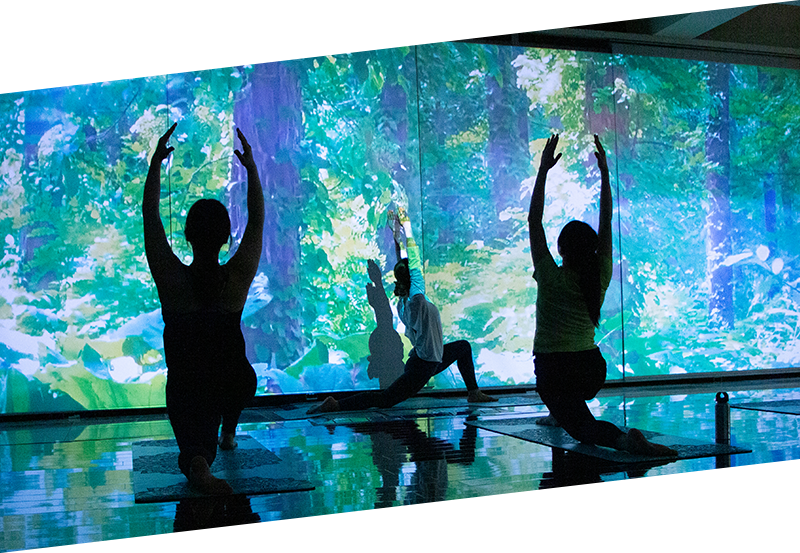 幻想的な映像が生み出す新感覚ヨガを味わえます。幻想的な映像の中で行うことでリラクゼーション効果を感じ、視覚からの脳への刺激で美肌・代謝アップ、さらには目の疲れにも効果的です。