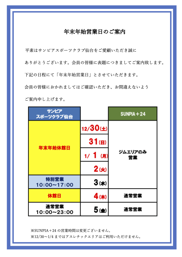 2023年12月30日(土)〜2024年1月2日(火)の期間中は、付帯のサンピアスポーツクラブ仙台の年末年始休館日となります。