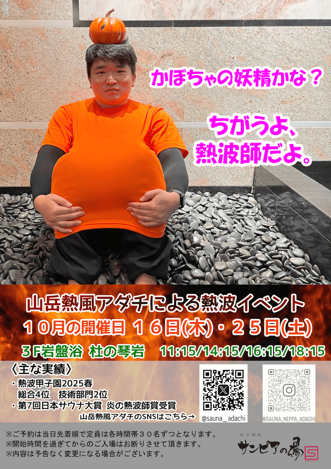 10/16(木)、10/25(土)当館岩盤浴「杜の琴岩」におきまして、毎月恒例となっている熱波師の山岳熱風アダチさんによる熱波イベントを開催いたします。