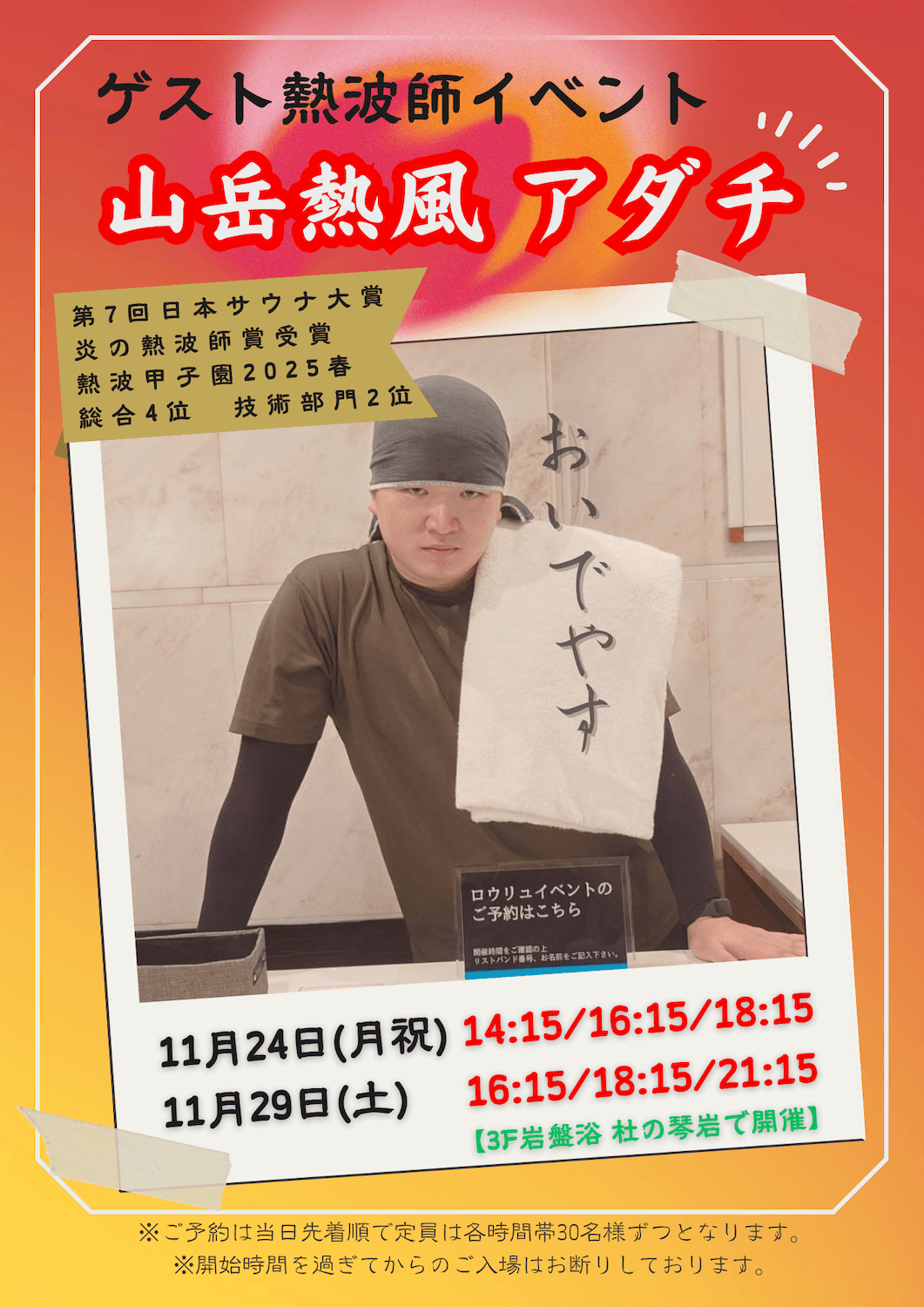 11/24(月・祝)、11/29(土)当館岩盤浴「杜の琴岩」におきまして、毎月恒例となっている熱波師の山岳熱風アダチさんによる熱波イベントを開催いたします。