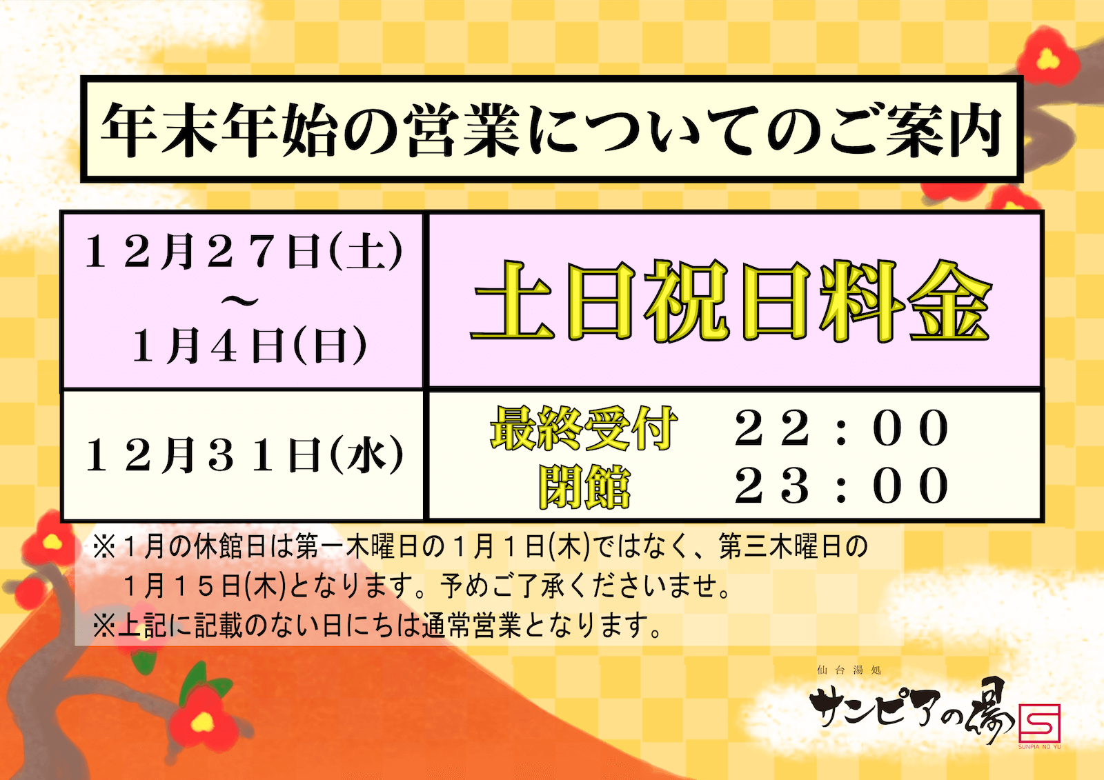 (12/31(水)のみ最終受付22:00、閉館23:00までの短縮営業とさせて頂きます。)