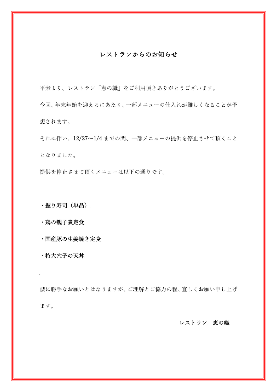 レストラン恵の織では、年末年始を迎えるにあたり一部メニューの仕入れが困難になることから、