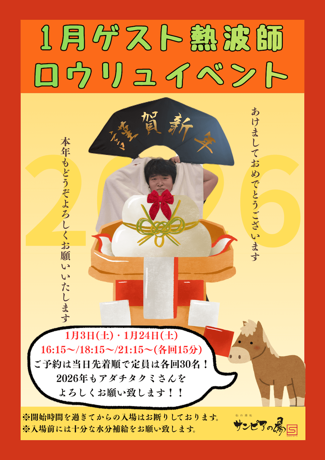 1/3(土)、1/24(土)当館岩盤浴「杜の琴岩」におきまして、毎月恒例となっている熱波師の山岳熱風アダチさんによる熱波イベントを開催いたします。