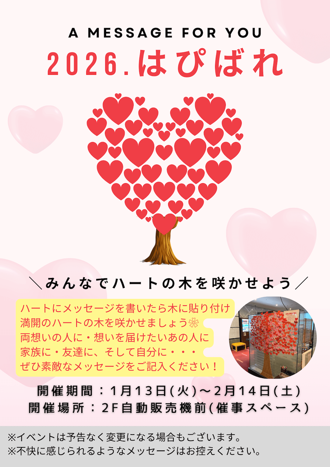 1/13(火)~2/14(土)の期間中、2F自動販売機前にハートの木を設置いたします。 ハート型のメッセージカードをご用意しておりますので、大切な人や想いを届けたいあの人に、メッセージを記入してハートの木につるしてくださいね。