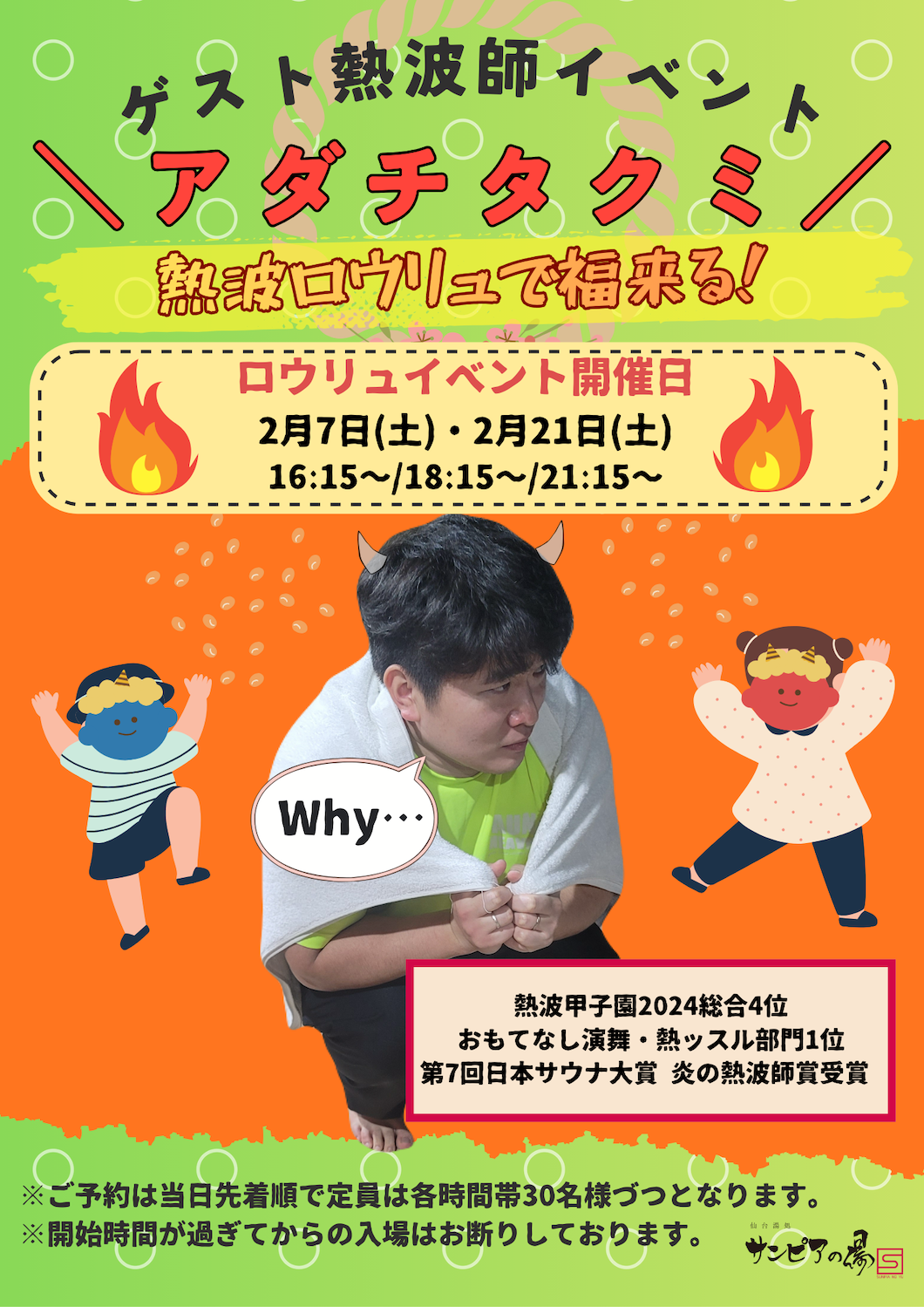2/7(土)、2/21(土)当館岩盤浴「杜の琴岩」におきまして、毎月恒例となっている熱波師のアダチタクミさんによる熱波イベントを開催いたします。