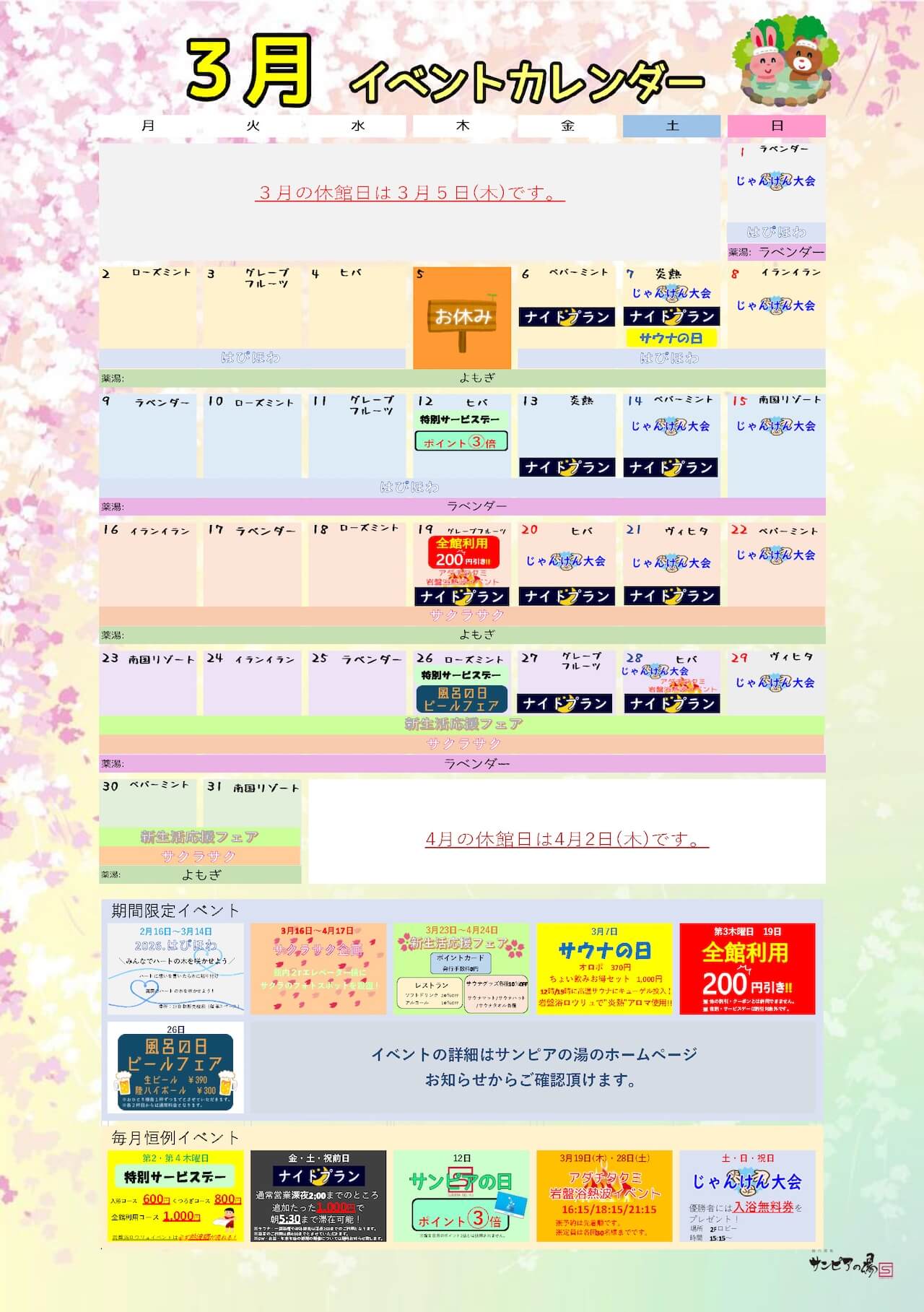 いつも仙台湯処 サンピアの湯をご利用いただき誠にありがとうございます。 3月も様々なイベントをお楽しみいただけます。